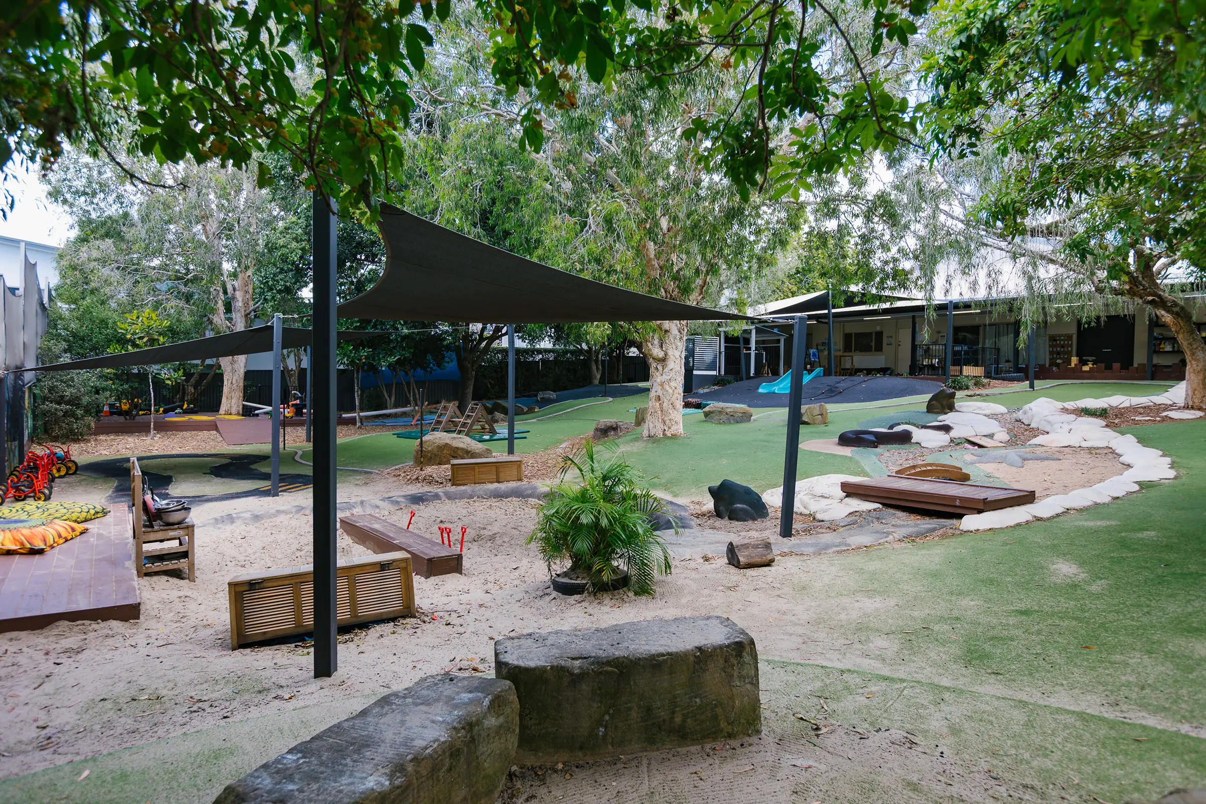 We love to foster a strong connection to nature in these bespoke nature play environments. These inviting spaces are home to all sorts of interesting objects like stumps, rocks, river beds, mud kitchens and sand pits, everything a little explorer needs.